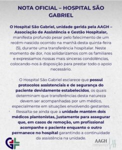 De acordo com o Hospital São Gabriel, a transferência da paciente ocorreu sob responsabilidade de uma médica da unidade. Após análise inicial do caso, o hospital informou que a profissional não teria seguido os protocolos estabelecidos para esse tipo de procedimento.