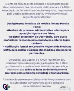 O hospital também informou, por meio de nota, que está apurando as circunstâncias do ocorrido e prestando apoio à família da paciente e divulgou uma nota para Imprensa: